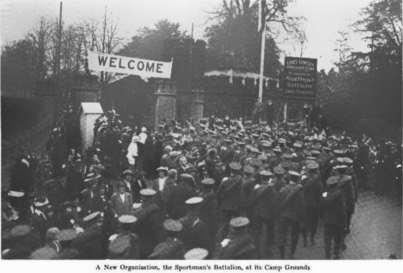The Sportsman’s Battalion has recently gone into training, receiving a rousing send-off as it marched through London on its way to entrain for its quarters in Essex. As its name implies, the corps is composed of men familiar with all kinds of outdoor sports. Fox hunters and cricketers, boxing experts and football players are soldiering shoulder to shoulder with Canadian baseball players and gentlemen jockeys. This “hard-as-nails” battalion. as it has been called, ought to give a good account of itself in active service.